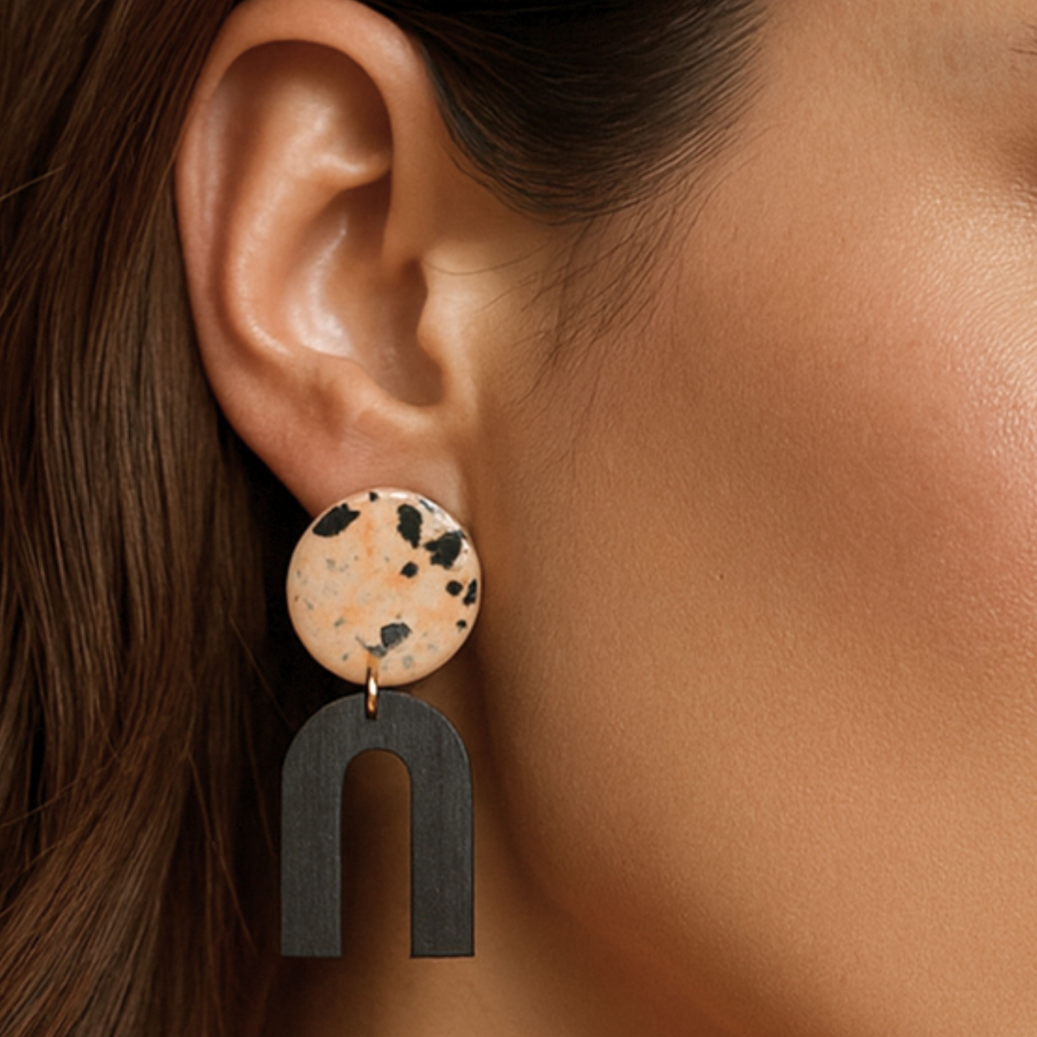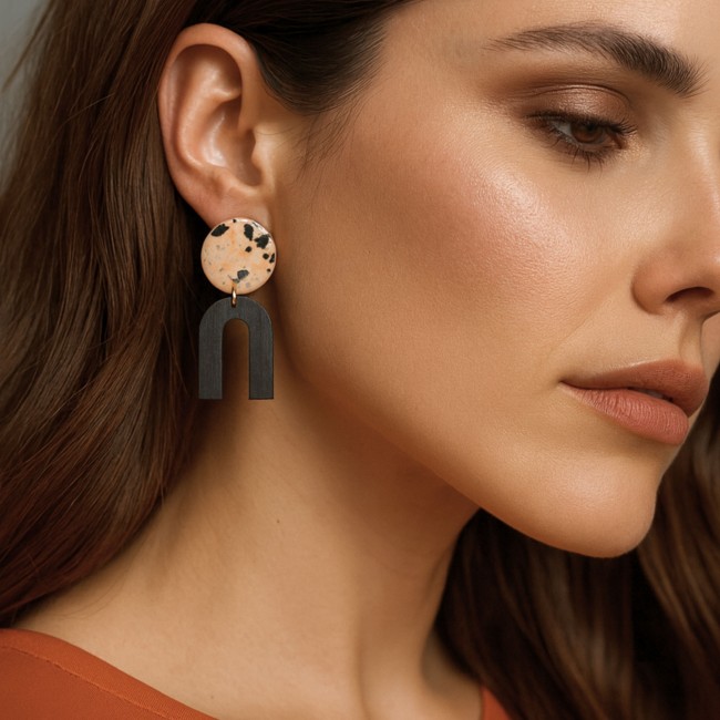 - Etant artisanale, chaque boucles d'oreilles sont différentes, le veinage de bois et les motifs de l'argile varient d'une paire à l'autre - photo non contractuelle