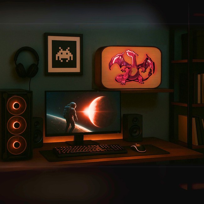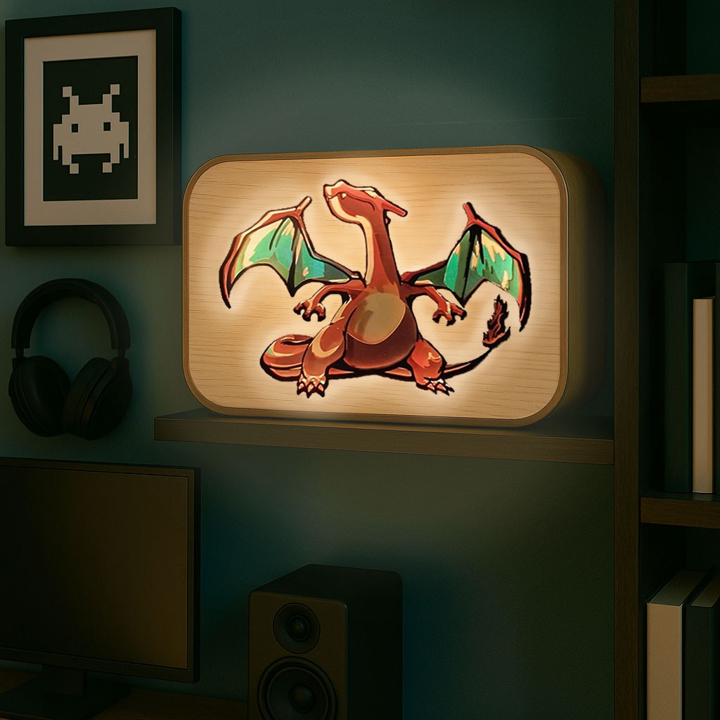 Découpée avec précision dans du contreplaqué de chêne, elle révèle un design coloré et expressif, sublimé par un rétroéclairage LED multicolore. Rouge braise, bleu glacier, orange volcanique… À chaque couleur, l’ambiance change et le dragon s’éveille ??