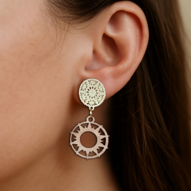 Gravée dans un cercle de bois ajouré, posée sur un fond vert profond, elle raconte des histoires anciennes.