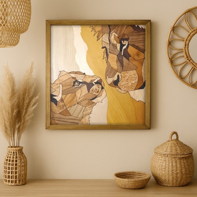 Ce tableau en marqueterie d’art capture la rencontre entre un ancien et sa relève, un père et son enfant. Dans leurs regards croisés se révèle la continuité d’une lignée, l’équilibre entre la sagesse acquise et la promesse d’un avenir encore à tracer.