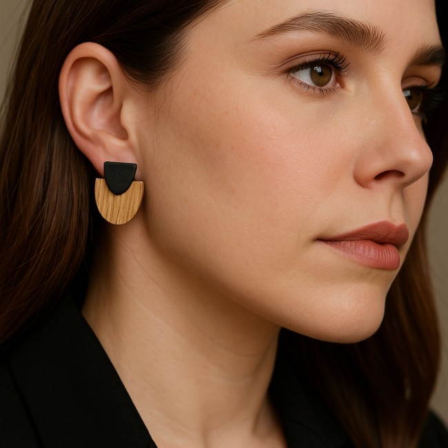 Ces boucles d’oreilles associent l’intensité profonde du poirier noir à la chaleur authentique du chêne. Leur design géométrique, sobre et raffiné, sublime la force du contraste bois clair/bois foncé. Lyana, c’est l’essence du chic minimaliste : un bijou intemporel qui attire les regards par sa simplicité maîtrisée.
