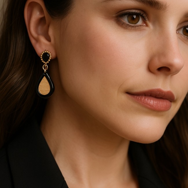 Ces boucles d’oreilles allient la profondeur élégante du poirier noir à la douceur lumineuse du chêne. Leur design en goutte, souligné par un contour doré délicat, met en valeur l’harmonie des matières. Amara incarne la féminité audacieuse : un bijou chic et intemporel, pensé pour celles qui veulent briller avec assurance.