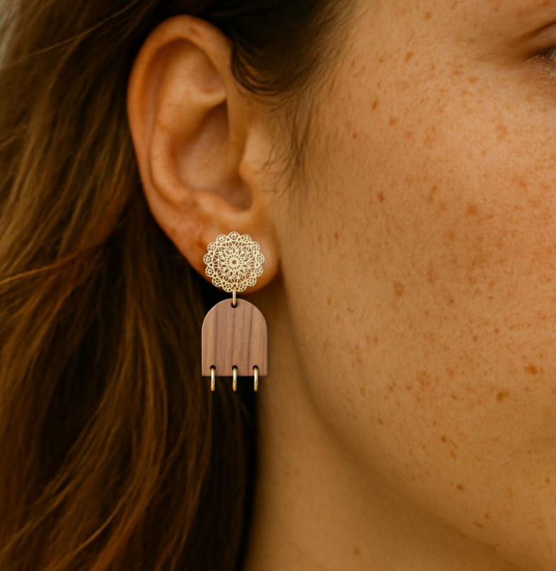 Ces boucles d’oreilles associent la délicatesse d’un motif en dentelle dorée à la force naturelle du bois de noyer. Leur design original, à la fois raffiné et affirmé, en fait une pièce qui attire la lumière et sublime chaque tenue. Althéa, c’est l’élégance bohème dans toute sa splendeur.