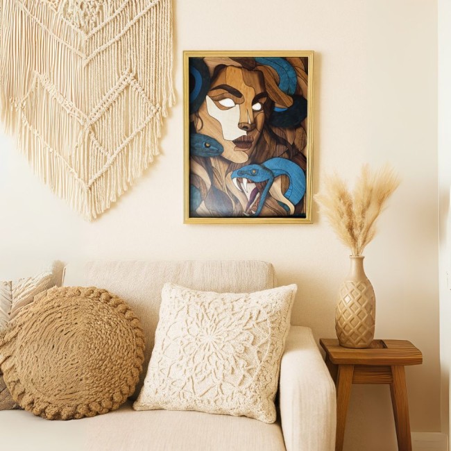Réalisée à la main dans la pure tradition de l’artisanat d’art, cette œuvre marie des placages de bois précieux minutieusement découpés et assemblés. Les nuances naturelles du noyer, du sycomore et du merisier se mêlent aux reflets profonds des serpents teintés de bleu, conférant à l’ensemble une puissance visuelle et spirituelle unique.