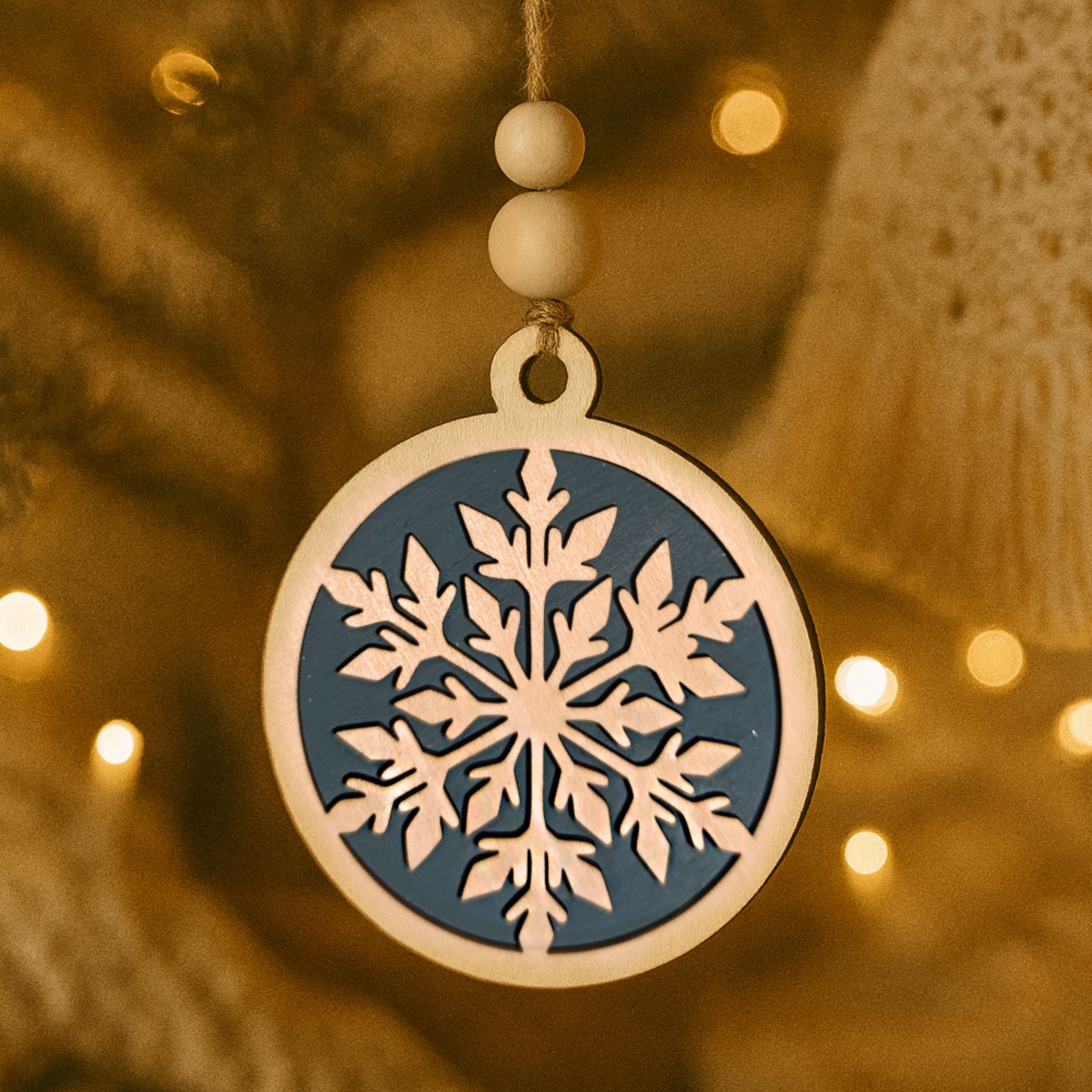 Son flocon minutieusement ajouré évoque la délicatesse de la neige et la beauté éphémère de l’hiver. Suspendue par une corde en jute naturelle ornée de deux perles en bois, elle incarne à la fois la finesse artisanale et la magie intemporelle de Noël.