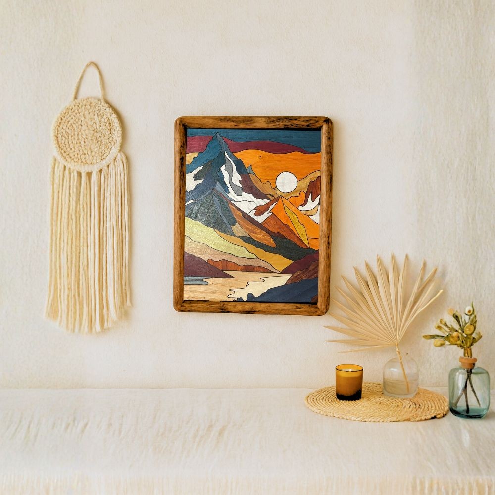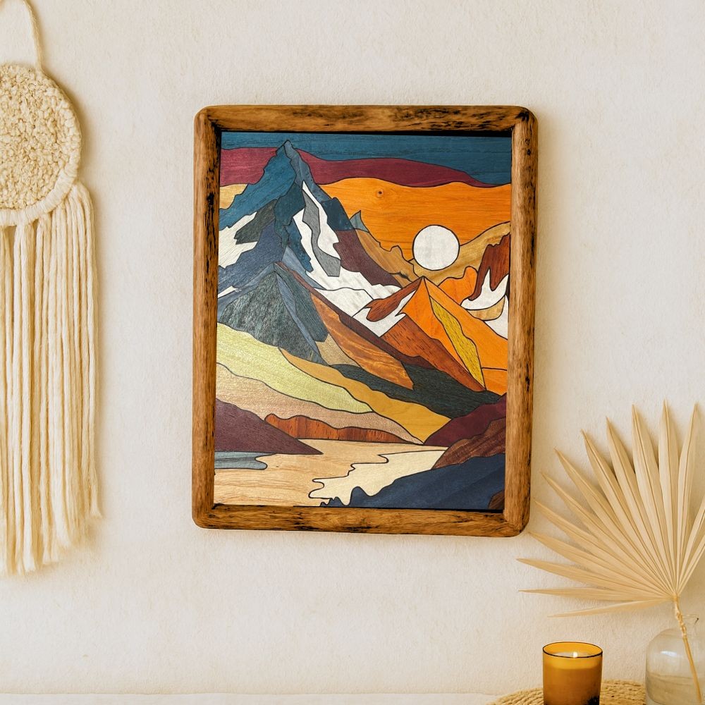 Le tableau en marqueterie Pyra est une ode à la montagne et à la lumière changeante de l’automne. Réalisée à partir de placages de bois précieux finement découpés et assemblés à la main, cette œuvre met en relief la puissance naturelle du bois à travers ses nuances, ses textures et ses reflets uniques.