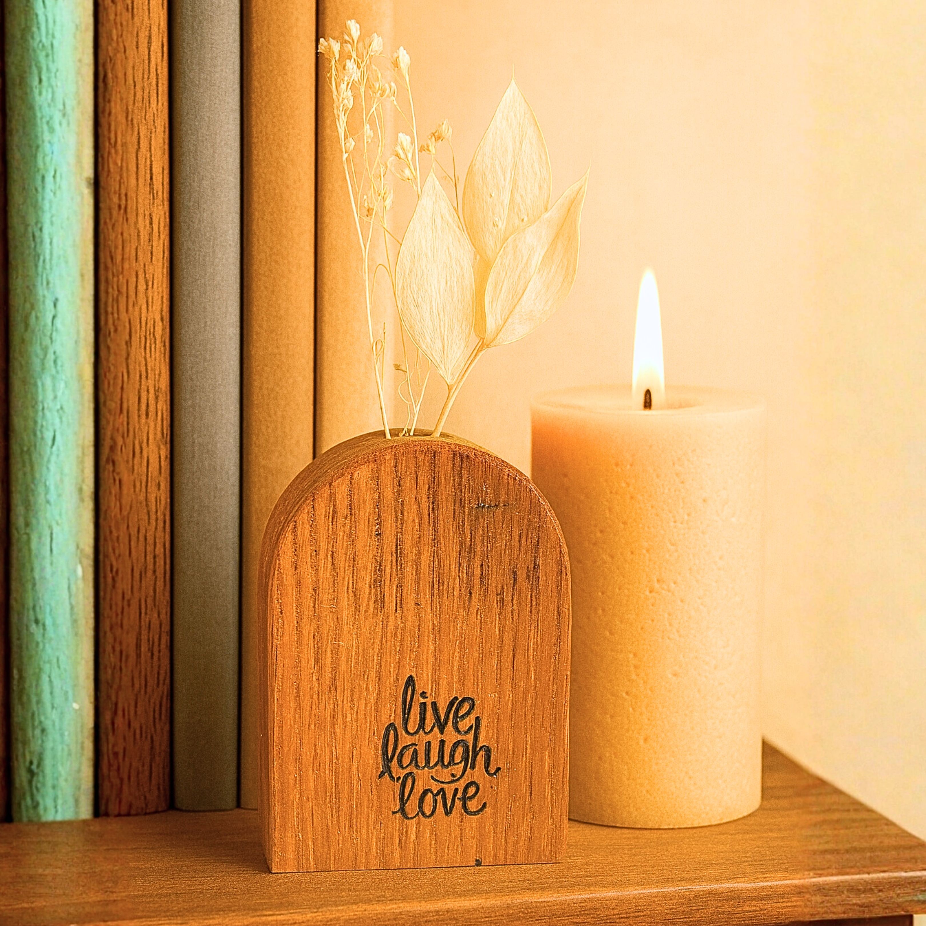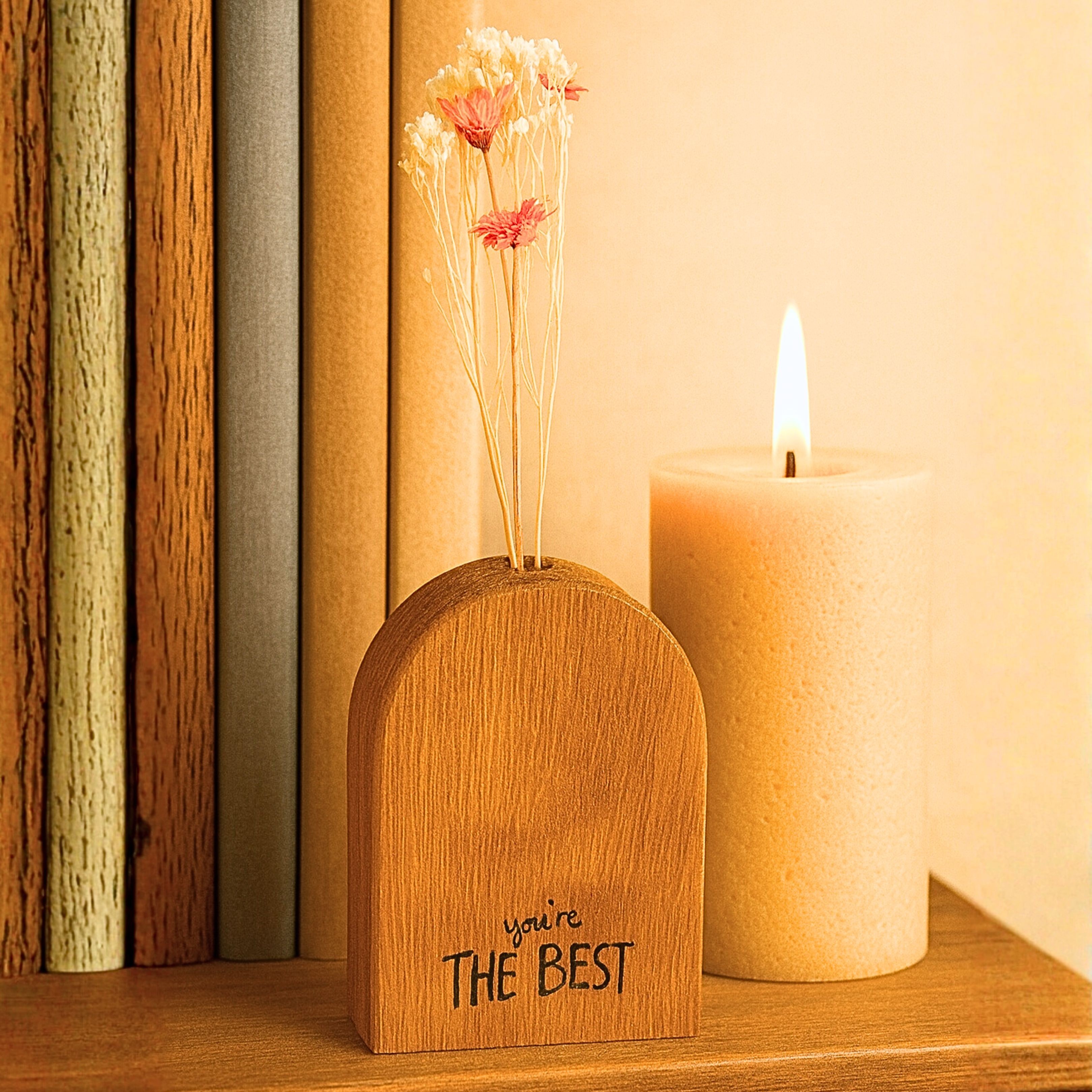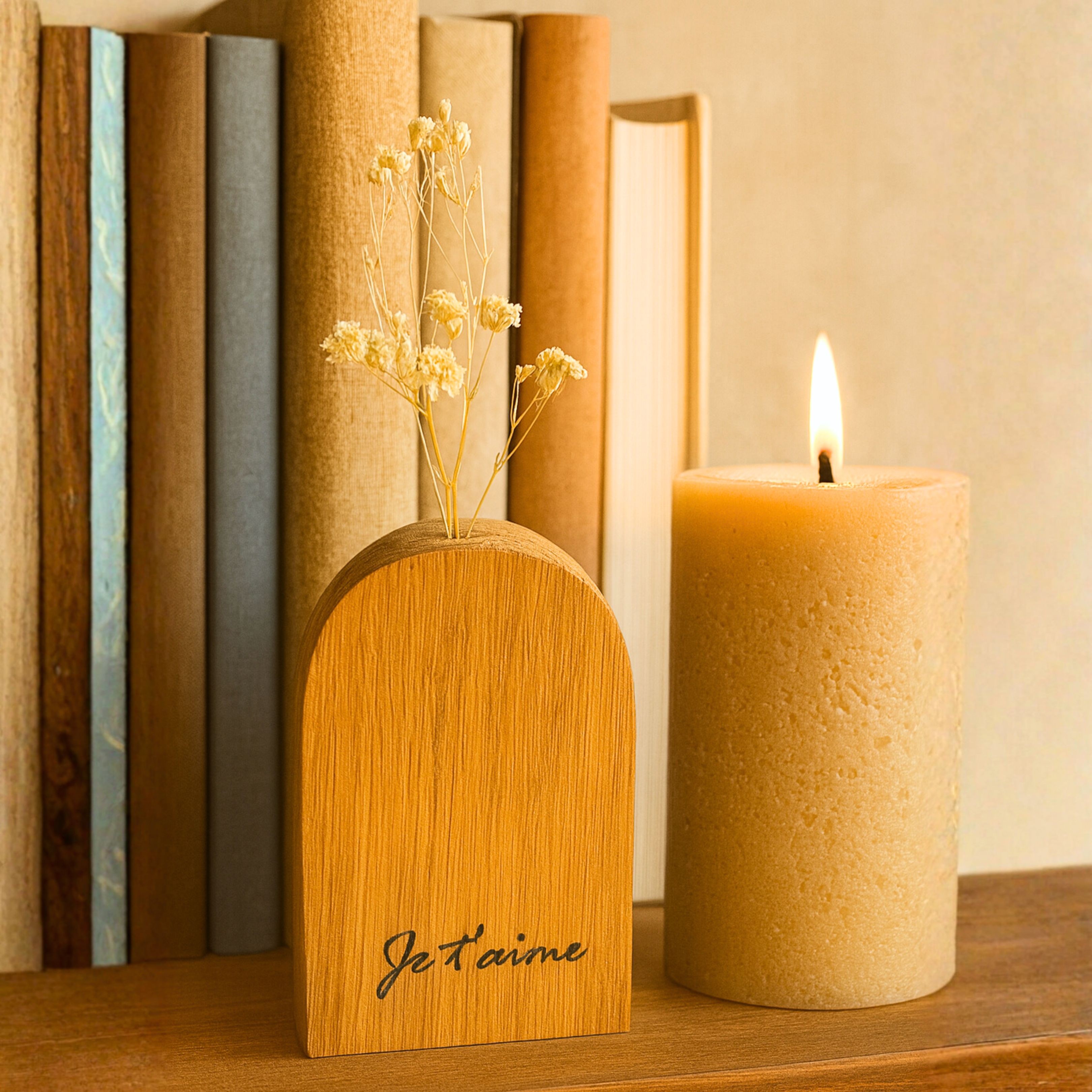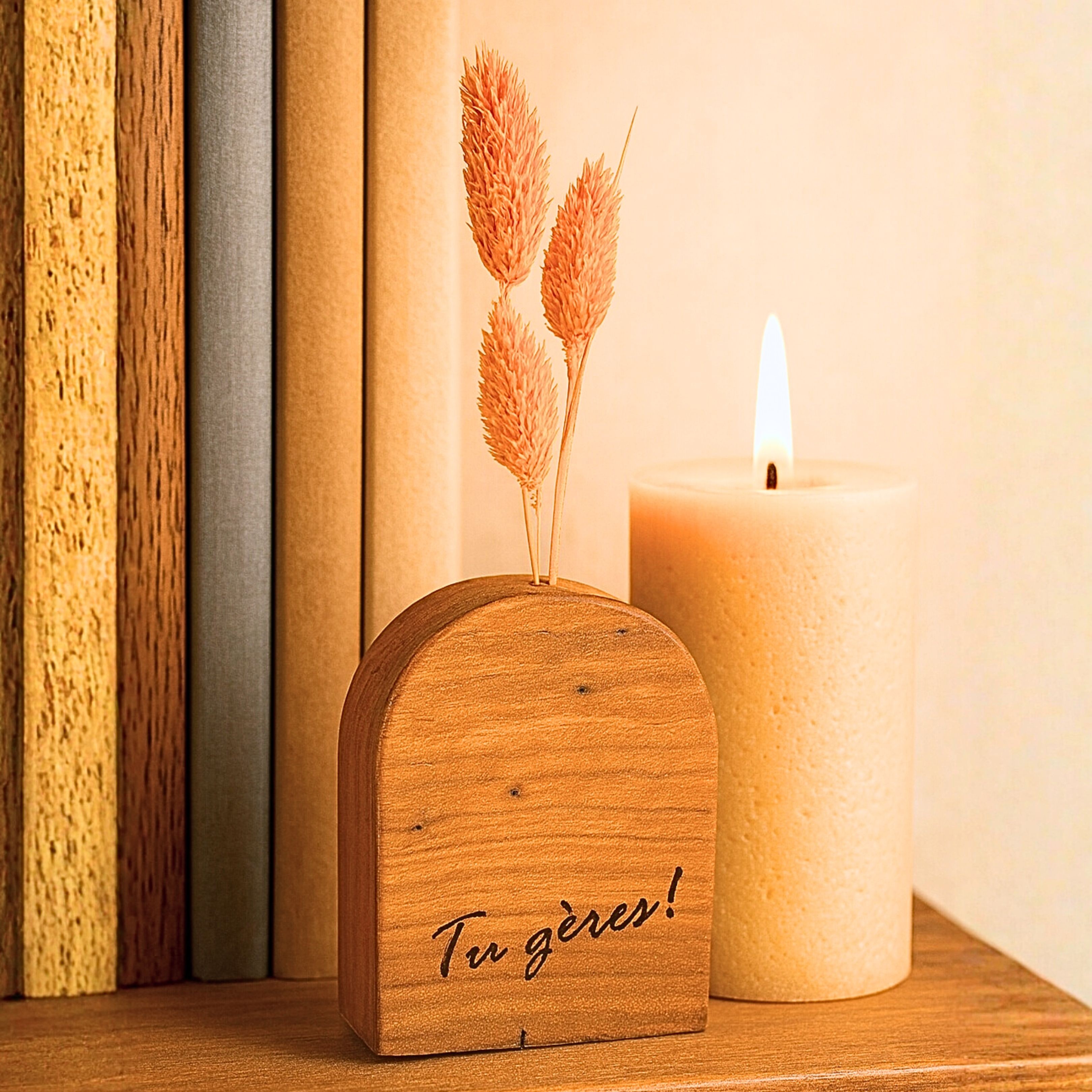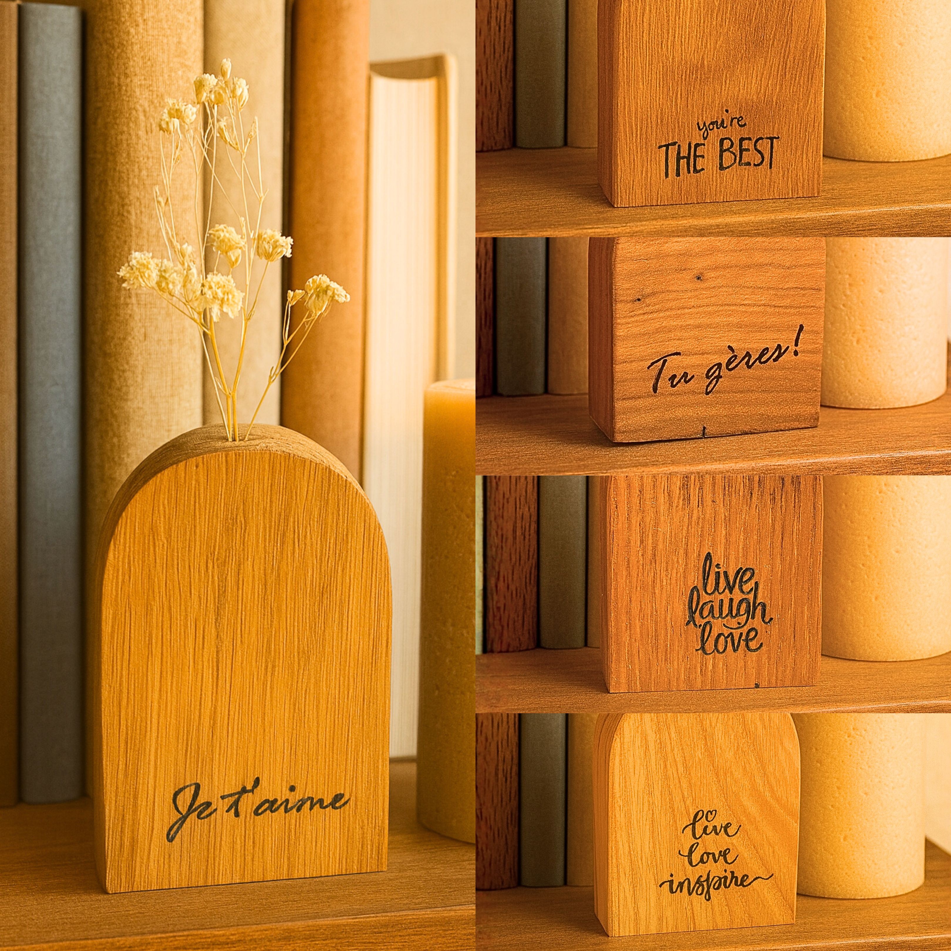 Gravés de mots positifs comme « Je t’aime », « Tu gères », « Love – Live – Inspire » ou « You’re the best », ces petits soliflores en bois deviennent des messages à offrir – pour soi, pour un ami, ou pour une personne chère.