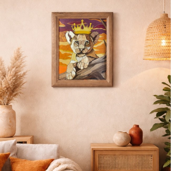 Chaque pièce de bois est découpée, ajustée et assemblée avec précision afin de donner vie au lionceau, à son regard et à son environnement chaleureux aux tons orangés et dorés.