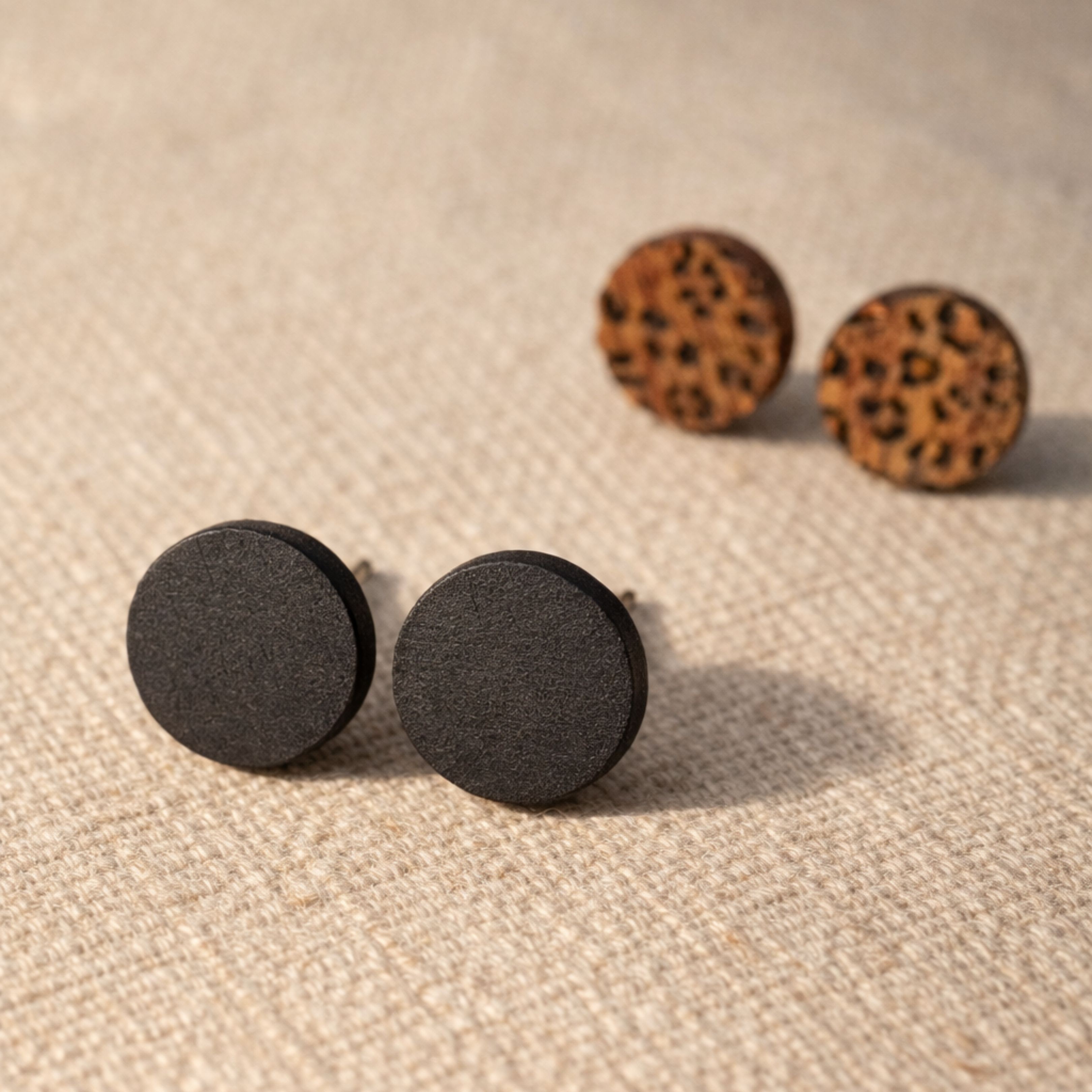 En contraste, les puces en ébène offrent une présence sobre et intemporelle. Leur noir profond, presque velouté, met en valeur la pureté de la forme ronde et la noblesse du bois.