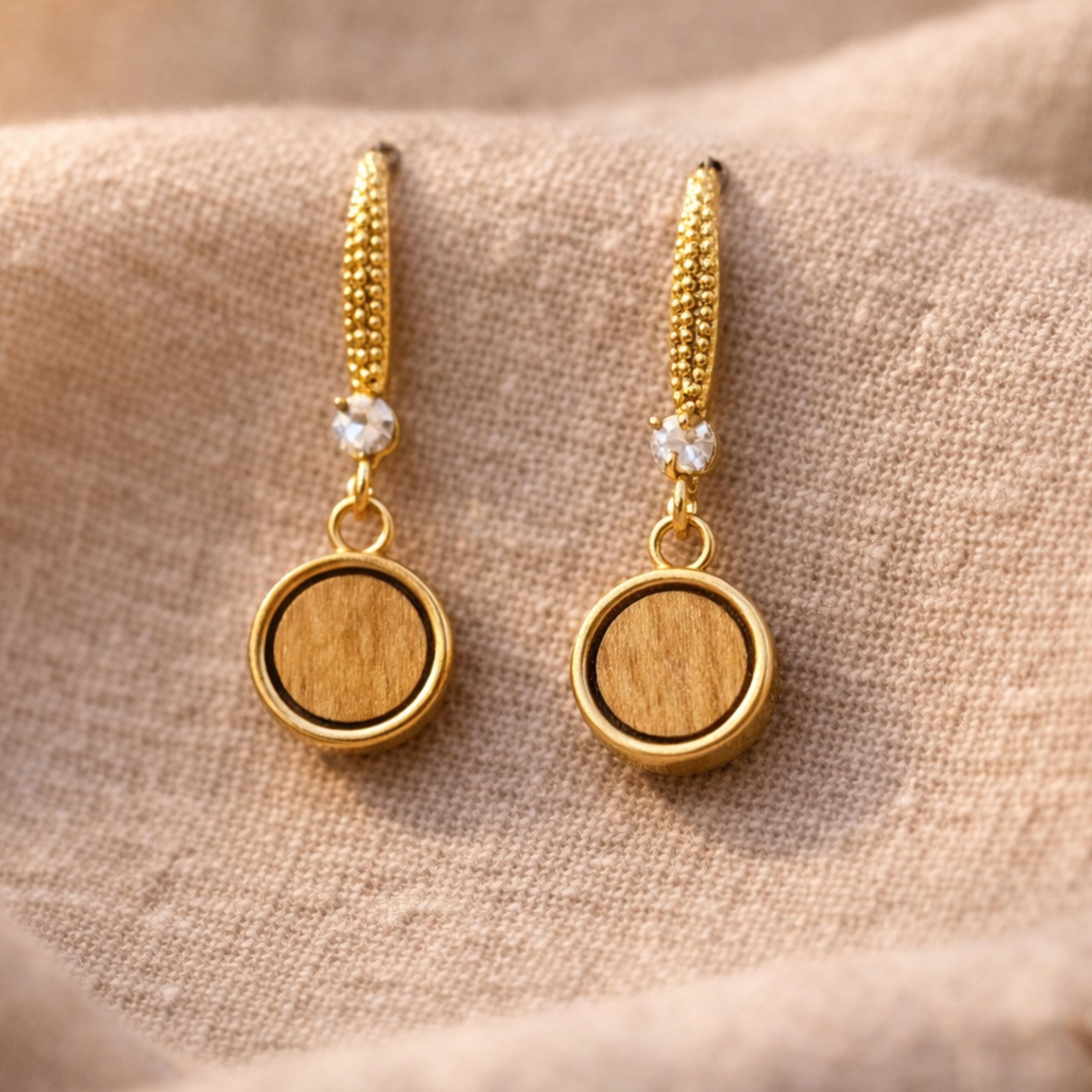 Chaque pastille révèle le veinage naturel du bois, rendant chaque paire unique. Le chêne, bois noble et chaleureux, apporte une touche authentique et intemporelle, tandis que le doré souligne l’ensemble avec finesse.