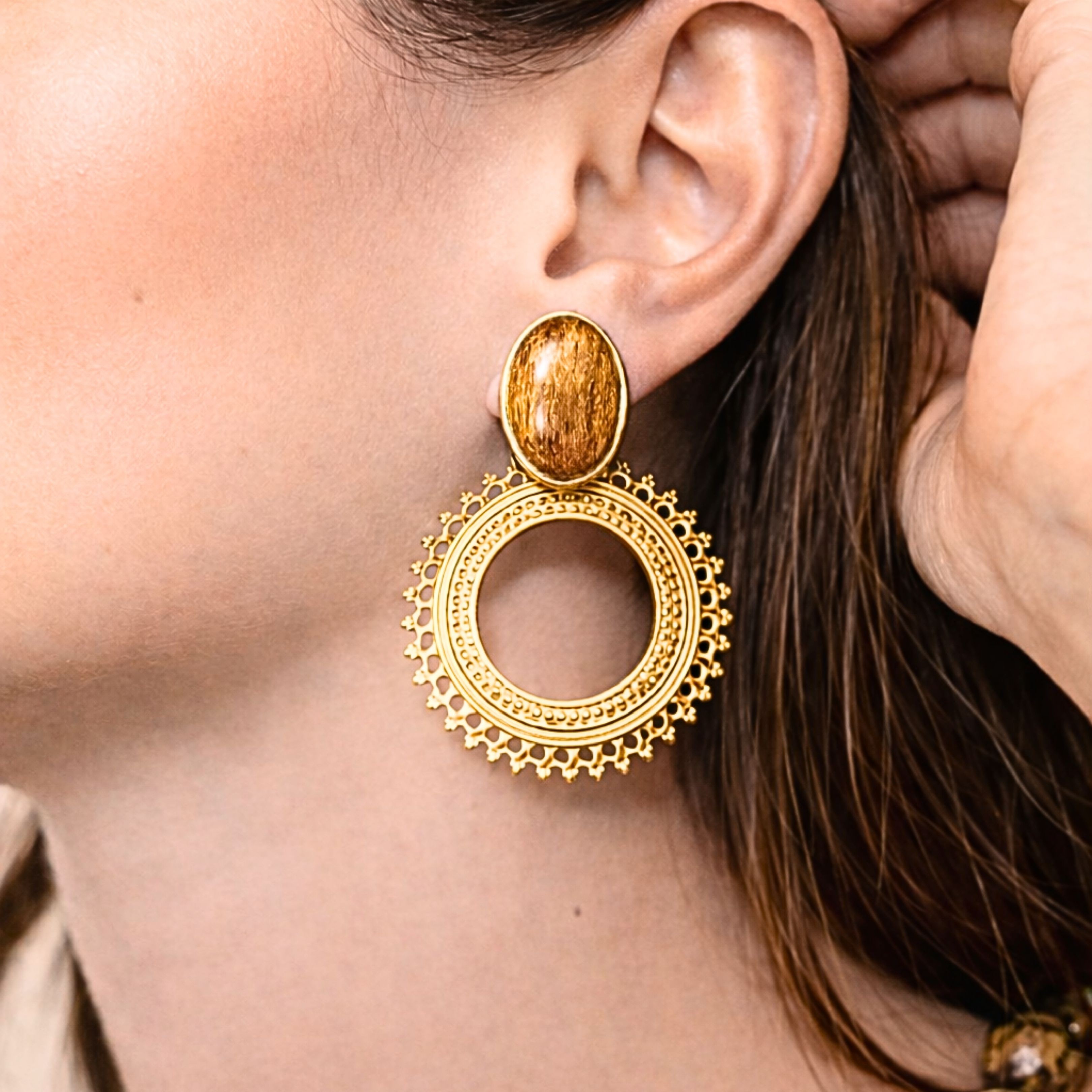 L’ovale de bois rencontre un grand cercle doré aux détails graphiques, créant un équilibre parfait entre force et finesse.
