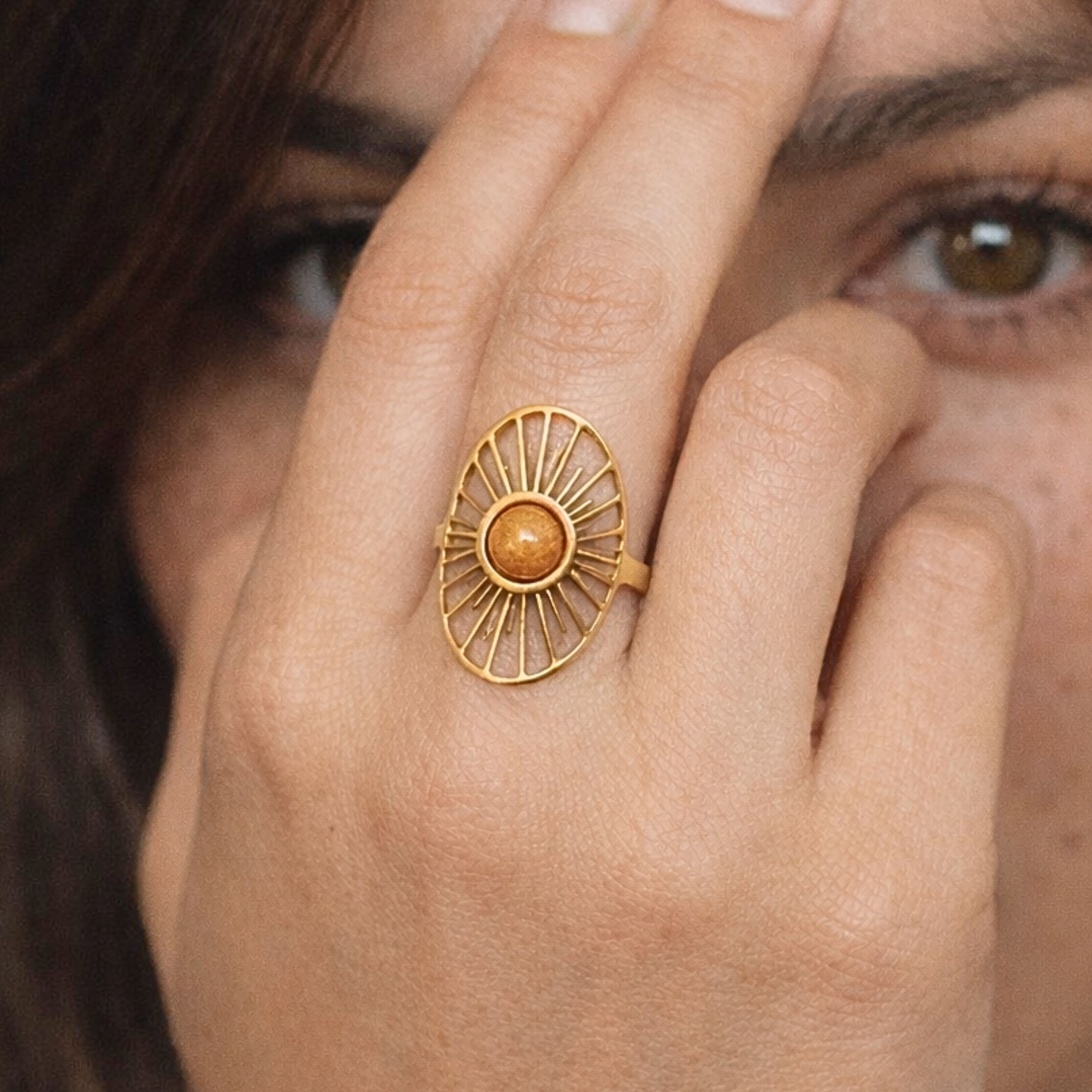 Le motif solaire ajouré qui l’entoure évoque les rayons du soleil : une énergie stable, protectrice et équilibrée.