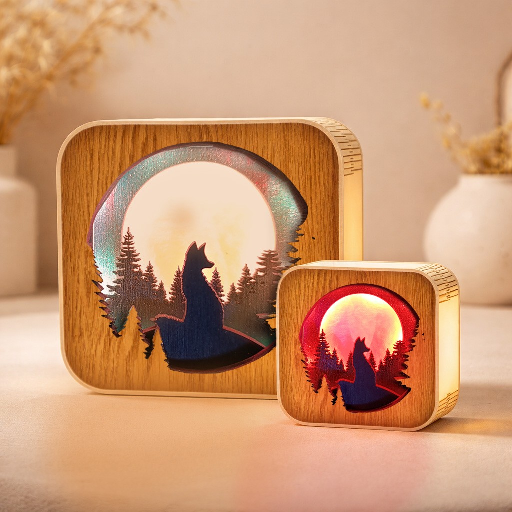 Grande veilleuse en bois – Scène magique nocturne – 20 × 20 cm – LED RGB