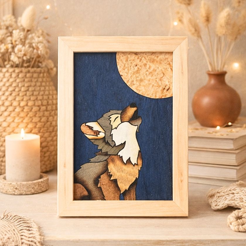 Le louveteau, tourné vers la lune, symbolise l’innocence mêlée au courage naissant.