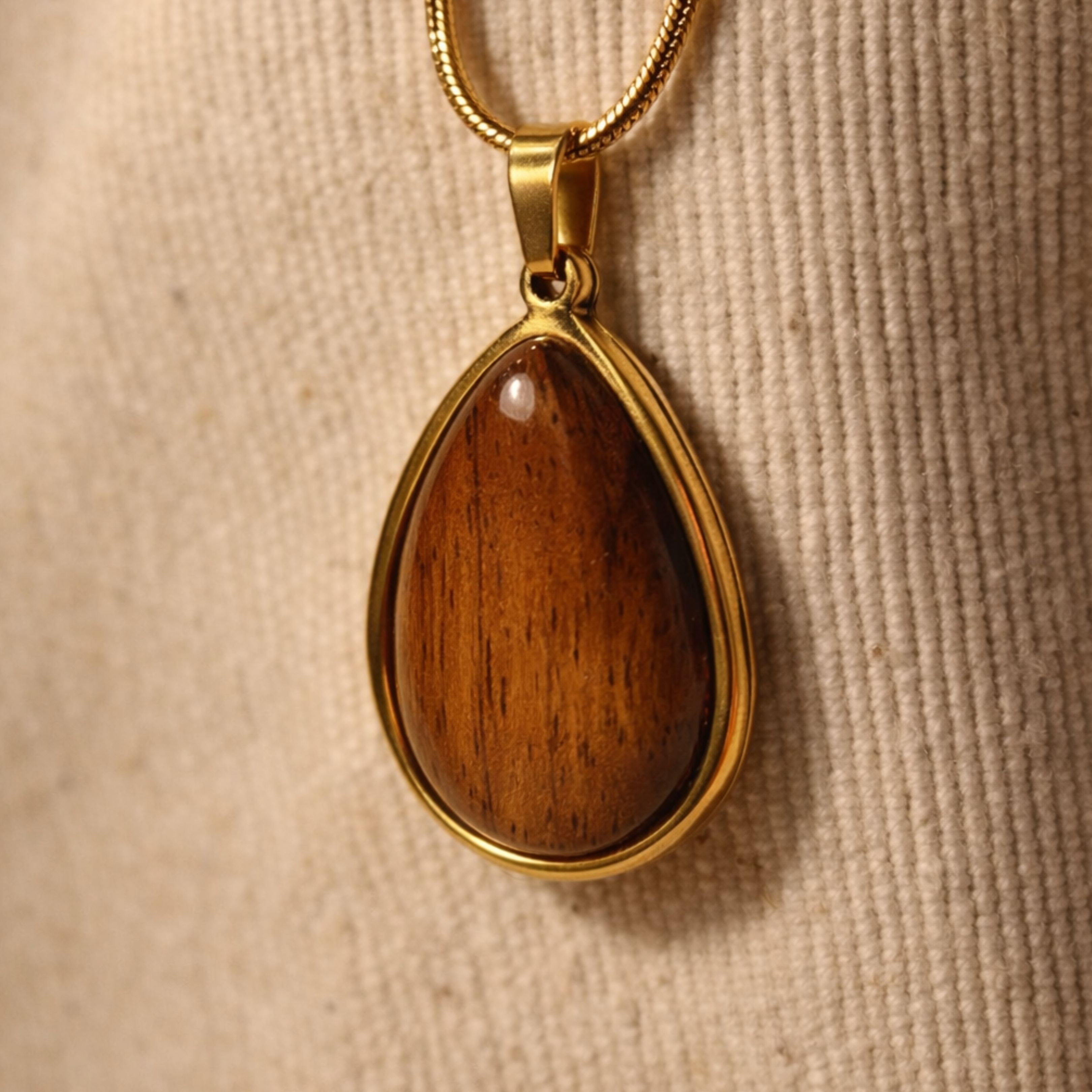 Ce pendentif en forme de goutte est façonné à la main dans du noyer massif, un bois noble aux nuances profondes et chaleureuses. Chaque cabochon est découpé, taillé, poncé et ajusté un par un dans mon atelier, avant d’être protégé par une fine couche de résine brillante qui révèle toute la richesse du veinage naturel.